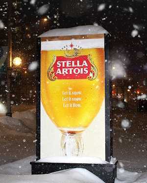 Beer brand Stella Artois deployed an out-of-home advertising to coincide with record snowfall in the Toronto area. The execution consisted of a 12-foot-tall billboard in downtown Toronto in the shape of a beer glass. The installation was designed to accumulate snow in a way that would resemble the foam on a glass of beer.