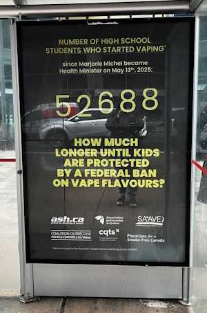 The Quebec Coalition for Tobacco Control has begun an out-of-home advertising campaign in Ottawa. The initiative aims to raise awareness of the issue of youth vaping. The bus shelter creative states that 50,000 high school students have begun vaping since Marjorie Michel became Minister of Health last May. The campaign encourages government officials to institute a national ban on flavoured e-cigarettes.